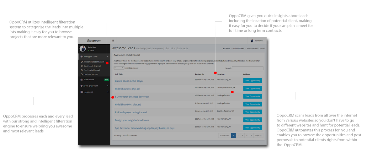 OppoHub works as a central hub for all the opportunities available around the web. Our custom and inhouse developed engine collects potential leads from all over the internet and presents you in a nice and responsive interface. OppoHub lets you review project requirements and post proposals to projects of your choice using an easy to use interface.